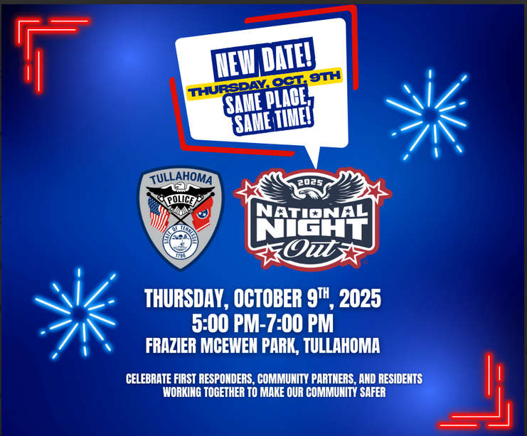 Due to the forecast for rain the Tullahoma Police Department has rescheduled their National Night Out event.